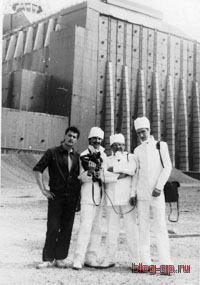 Слева направо: Наш гид Феликс Артеменко, оператор Юра Клишев, я и сотрудник студии - звукотехник. Чернобыль. 4-й блок. Август-сентябрь, 1986 г.