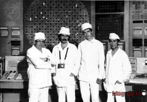 На фото слева направо у пульта управления:режиссер М.Блехман, кинооператор Ю.Клишев и 2 технических работника студии. Чернобыль. 4-й блок. Август-сентябрь, 1986 г.