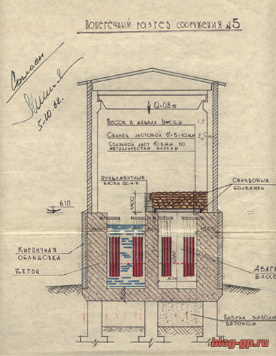 Справка. Здание № 5 (рис. 1) – самое большое строение в составе 569 БТБ (длина – 74 м, ширина – 15 м, наибольшая высота – 18 м, площадь застройки – 806 м2). Конструктивно была выбрана простая схема – в общем технологическом зале размещались два вытянутых автономных бассейна, где под защитным слоем воды (она же охладитель) на встроенных консолях и цепных подвесках развешивались 7-местные упаковки (чехлы) с отработавшими сборками (ОТВС). Проектная емкость хранилища – 2070 чехлов, что соответствовало размещению топлива от 75-80 реакторов ПЛА. Дно и стенки бассейнов до отметки +6,2 выполнялись из ж/б монолита толщиной в 1 метр, снаружи монолит обшивался 2-мя слоями минерализованной пробки и закрывался кирпичной кладкой. Изнутри бассейны облицовывались тонкостенными листами стали. Первая очередь хранилища (длина бассейна – 18,5 м) вводилась в 1962 г., вторая (длина бассейна – 36,5 м) – в 1972 г. Проектант сооружения – ГСПИ-11, с 05.09.1945 головная проектная организация Минсредмаша (ныне ОАО «ВНИПИЭТ»).