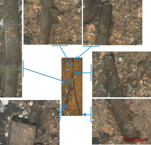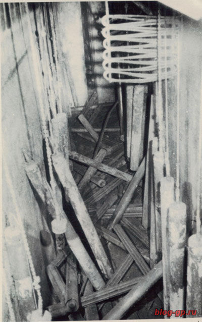 Рис. 7. Фрагменты разрушенных ОТВС на дне бассейна здания 5 (виден пучок обнаженных ТВЭЛ), 2010 г.