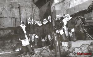 Рис. 5. Последний чехол. Участники работ в технологическом зале здания 5. Третий справа – В.К.Булыгин, пятый слева – В.А.Шумаков, 11.12.1989 г.