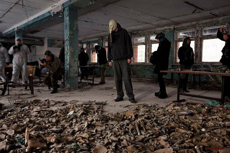 13. В 2011 году украинское правительство официально легализовало туризм в зоне отчуждения. В Припяти, посетители получают возможность побродить по усыпанным мусором коридорам и пустые классы школы. Сотни противогазов лежат в столовой. Один из туристов привез свой противогаз, но не для того, чтобы защитить себя от радиации, а просто для того, чтобы сделать фотографии. Припять, Украина, 2011 год.
