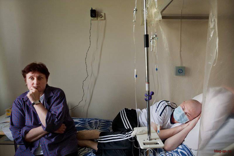 17. Больные раком щитовидной железы, Олег Шапиро, 54 года, и тринадцатилетний Дима Богданович в эндокринологической клинике в Минске, где ежедневно проводятся несколько десятков операций. Как ликвидатор аварии на Чернобыльской атомной станции, Олег подвергался воздействию экстремальных уровней радиации. Это была его третья операция на щитовидной железе. Мать Димы утверждает, что причиной онкологического заболевания сына стали радиоактивные осадки, но врачи более осторожны в своих заявлениях, поскольку белорусские чиновники склонны преуменьшать серьезность излучения, такова официальная позиция страны. Минск, Беларусь, 2005 год.