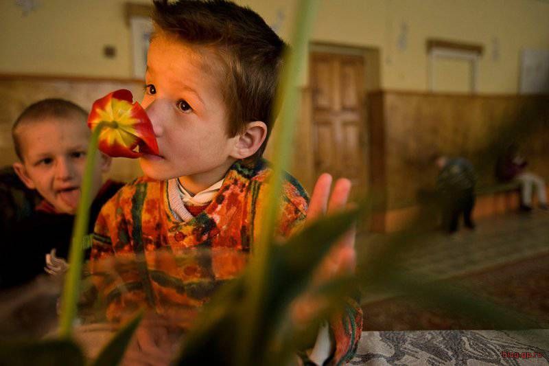 22. В приюте в Беларуси, умственно отсталый мальчик нюхает тюльпан. Дети, рожденные в регионе, подвергшемся воздействию радиоактивных осадков, как полагают ученые, имеют более высокий уровень врожденных пороков развития и отсталости. Такое мнение разделяют многие, но не все в научном сообществе. Международные благотворительные организации, которые были созданы в связи с последствиями радиоактивной катастрофы, продолжают оказывать столь необходимую финансовую поддержку для приютов и детских домов, где содержатся дети, пострадавшие от последствий аварии на Чернобыльской атомной электростанции. .Веснова, Беларусь, 2005 год.