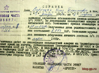 К военкомату тоже есть претензии. За 15 лет после Чернобыля нас трижды вызывали в военкомат, собирали копии документов о Чернобыле, говорили, что это надо для награждения нас орденами и медалями, и на этом всё заканчивалось. Попытался я в 2013 году решить этот вопрос через президента, написал ему письмо, пришел ответ от министерства обороны, что распоряжением президента все вопросы, связанные с Чернобылем, военкоматами больше не принимаются. Что это? Забыли про нас?