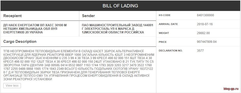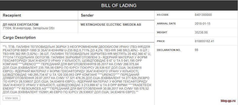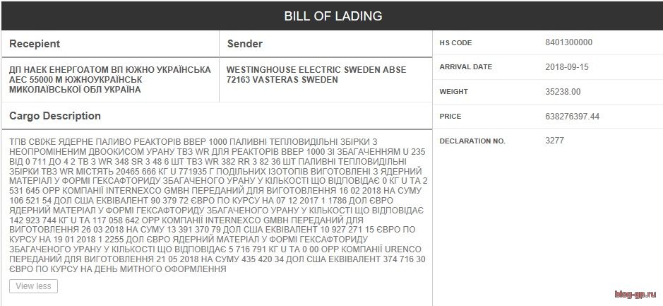 Об экономической целесообразности перехода украинских АЭС на американское ядерное топливо при этом было немало споров, а обе стороны — американская и украинская — отказывались публиковать информацию. EADaily получило данные, по которым можно судить о стоимости топлива Westinghouse для Украины. В нашем распоряжении оказались таможенные декларации о поставках тепловыделяющих сборок производства шведского подразделения компании для украинского «Энергоатома». Они доступны на международном сайте таможенных деклараций ImportGenius.