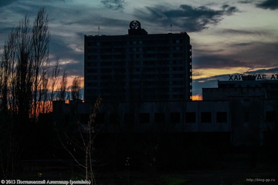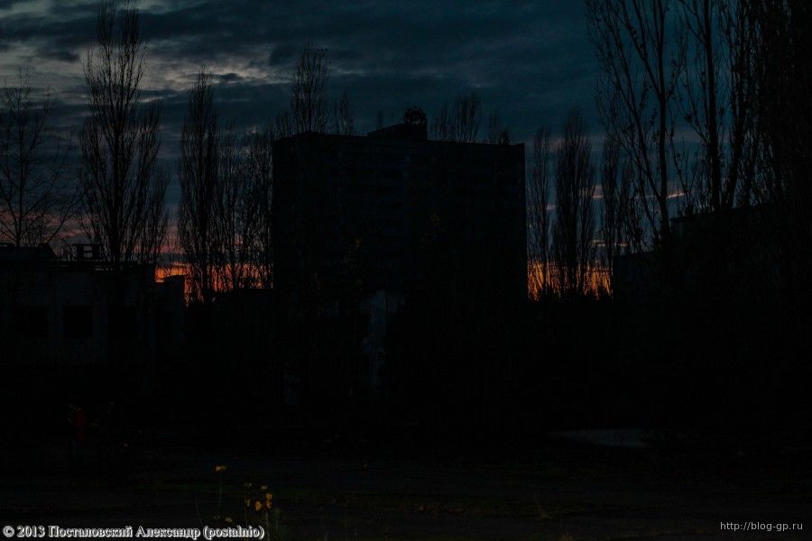 Мне, как и моим коллегам по поездке, несказанно повезло. Нам посчастливилось увидеть одно из самых фееричных явлений, которые только могут произойти в городе. Речь идет о наступлении ночи в Припяти. Солнечный закат, сумерки, тишина, наступление темноты, ночь... Оставленный человеком город погружается в сон и этот процесс мне удалось запечатлеть. Я просто стоял на центральной площади города на улице Курчатова и фотографировал окрестности, наблюдая за наступлением ночи в городе. Фотографии, представленные ниже, фактически не подвергались обработке. Такие снимки просто не хочется обрабатывать, чтобы не искажать восприятие наступающей припятской ночи.