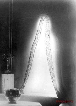 Можно, конечно, объяснять дефектом печати, но тогда зачем супруга поэта хранила именно эту некачественную фотографию (фотограф, наверняка, сделал несколько снимков)? И зачем были пририсованы края штор?