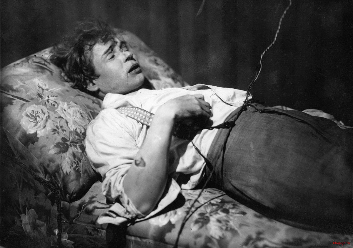 Фото убитого Есенина на диване гостиницы. На лбу у переносицы видна вмятина от удара.