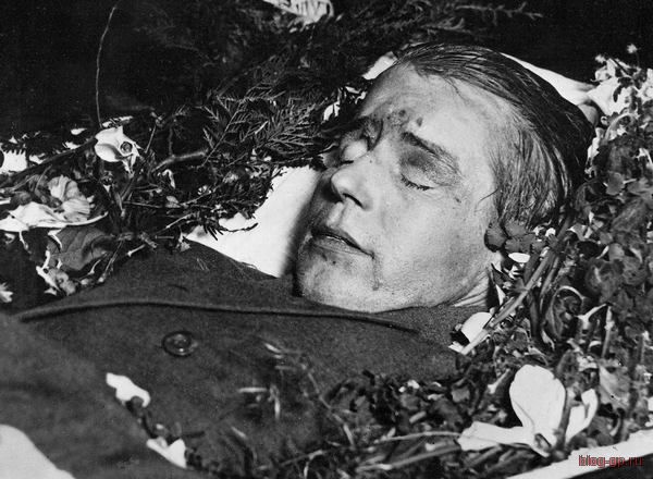 Есенин в гробу. Лицо сильно загримировано, но следы побоев заметны