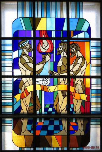 Автор серии витражей, украинский художник-монументалист Николай Семенович Линник поясняет, что стеклянные картины отображают всю историю энергетики, начиная с преподнесения Прометеем людям дара в виде огня и заканчивая расщеплением ядра и полетами в космос.