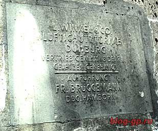 На снимке слева: Табличка у входа в башню в Нойкирхене. На ней указано, что это башня ПВО фирмы Лео Винкель и Ко., построена по лицензии фирмой Фр.Брюггерманн в Гамборне.