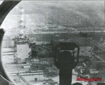Разрушенный 4-й энергоблок, снятый с рабочего места Ми-6 подп-ка А.В. Костенко. 9 мая 1986 г.